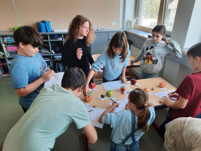 In Ernährung und Haushalt drehte sich alles um das Thema Apfel. Die Schüler*innen lernten unterschiedliche Apfelsorten kennen, kosteten diese und wählten ihre Lieblingssorten. Zur Verkostung standen auch unterschiedliche Apfelsäfte, Apfelringe, Apfelchips und Apfelmus. Die Schüler*innen bereiteten ein Apfelkompott zu und erfuhren wie einfach man selbst Apfelmus machen kann.