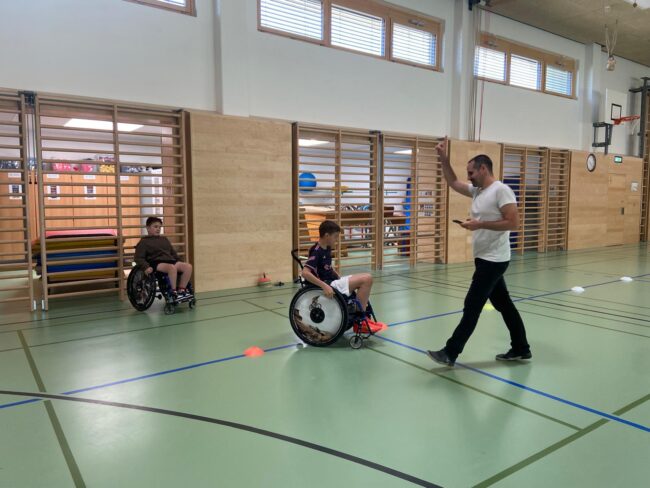Am 30. April 2025 durften die Schüler*innen der 1. Klassen eine ganz besondere Turnstunde verbringen. Nachdem einer unserer Schüler seinen neuen Rollstuhl bekommen hat, brachte er seinen alten Rollstuhl mit und die anderen Kinder durften nicht nur Probesitzen, sondern auch austesten, wie es sich anfühlt, verschiedene Situationen im Rollstuhl zu bewältigen. Das Resümee: Gar nicht…