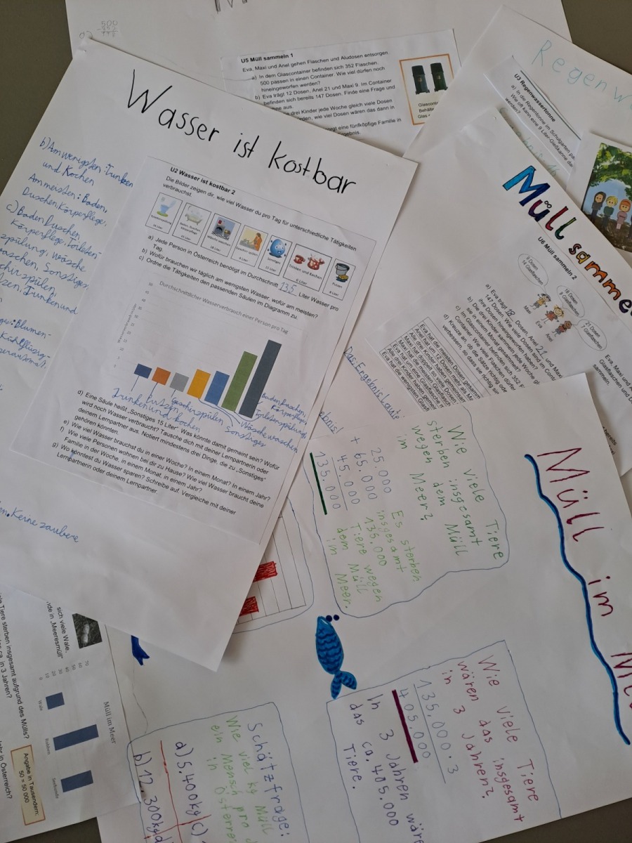 Im Mathematikunterricht recherchierten die Schüler*innen der 1b zu den Themen „Wasser ist kostbar“, „Müll sammeln“ und „Müll im Meer“ und erstellten dazu verschiedene Rechenaufgaben.