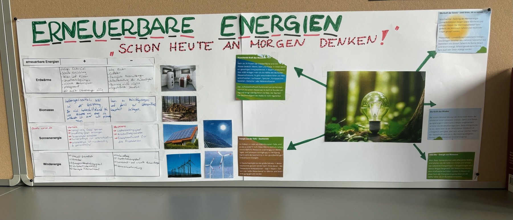 In Geografie und wirtschaftliche Bildung wurde zum Thema ,,Erneuerbare Energien’‘ gearbeitet. In Gruppen informierten sich die Schüler*innen über Sonnenenergie, Windenergie, Biomasse und Erdwärme, arbeiteten Vor- und Nachteile heraus und gestalteten ein toll gelungenes Plakat dazu.