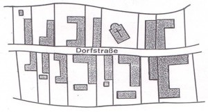 Bei diesem Dorftypus erfolgt die Anordnung der rechteckigen Parzellen an beiden Seiten einer relativ geradlinigen, mittlerweile sehr langen Dorfstraße.