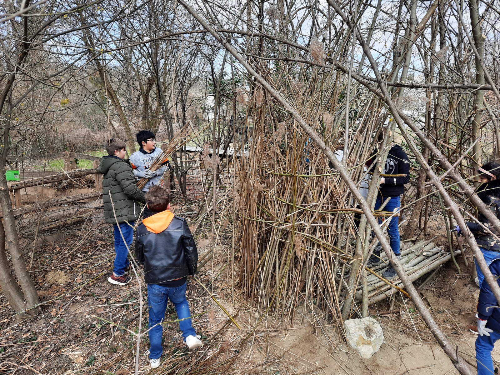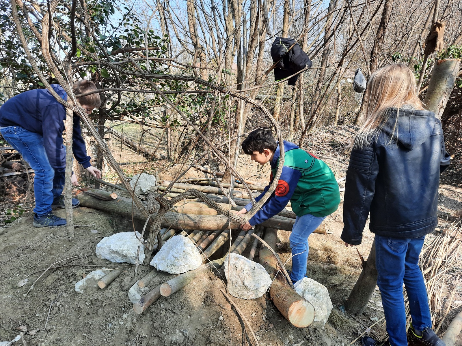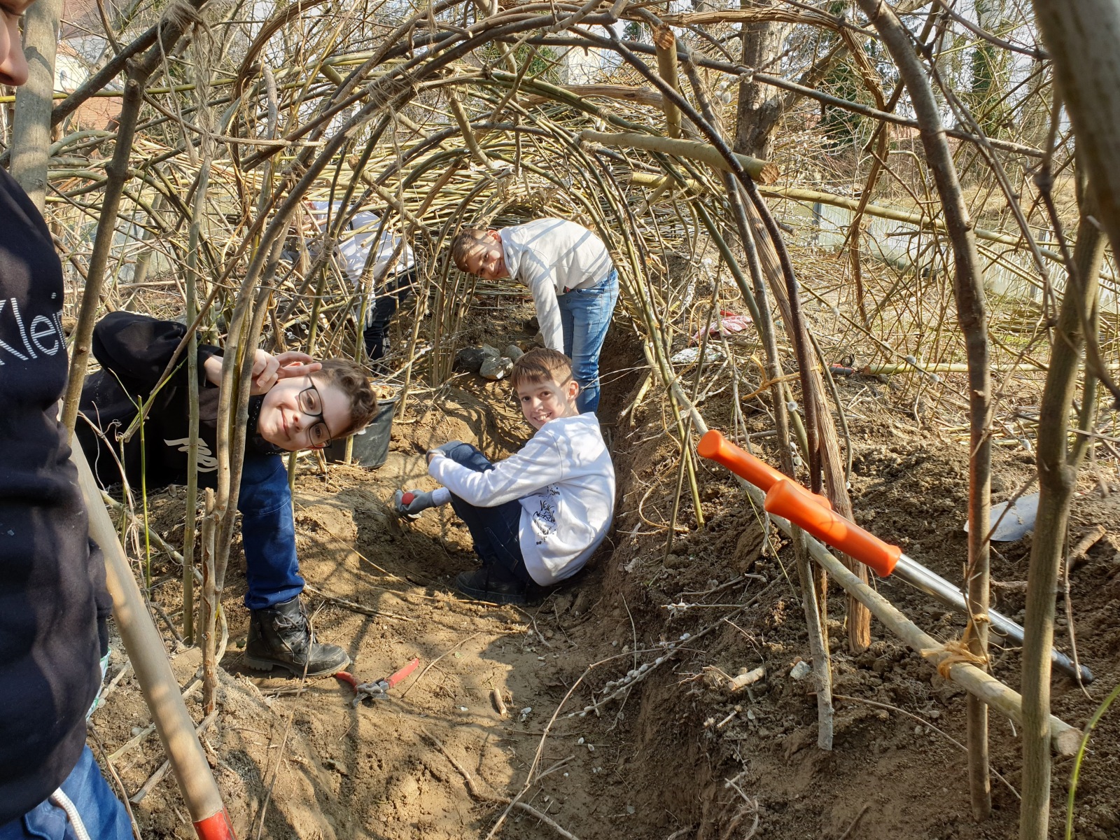 Sie hatten die Möglichkeit Tunnel und einen zeltartigen Unterschlupf mit Naturmaterialien wie Weidenstöcken und Lianen und ihrer Fantasie zu gestalten. Es wurde voller Tatendrang angepackt. Das Team des Nationalparks stellte Werkzeuge bereit.