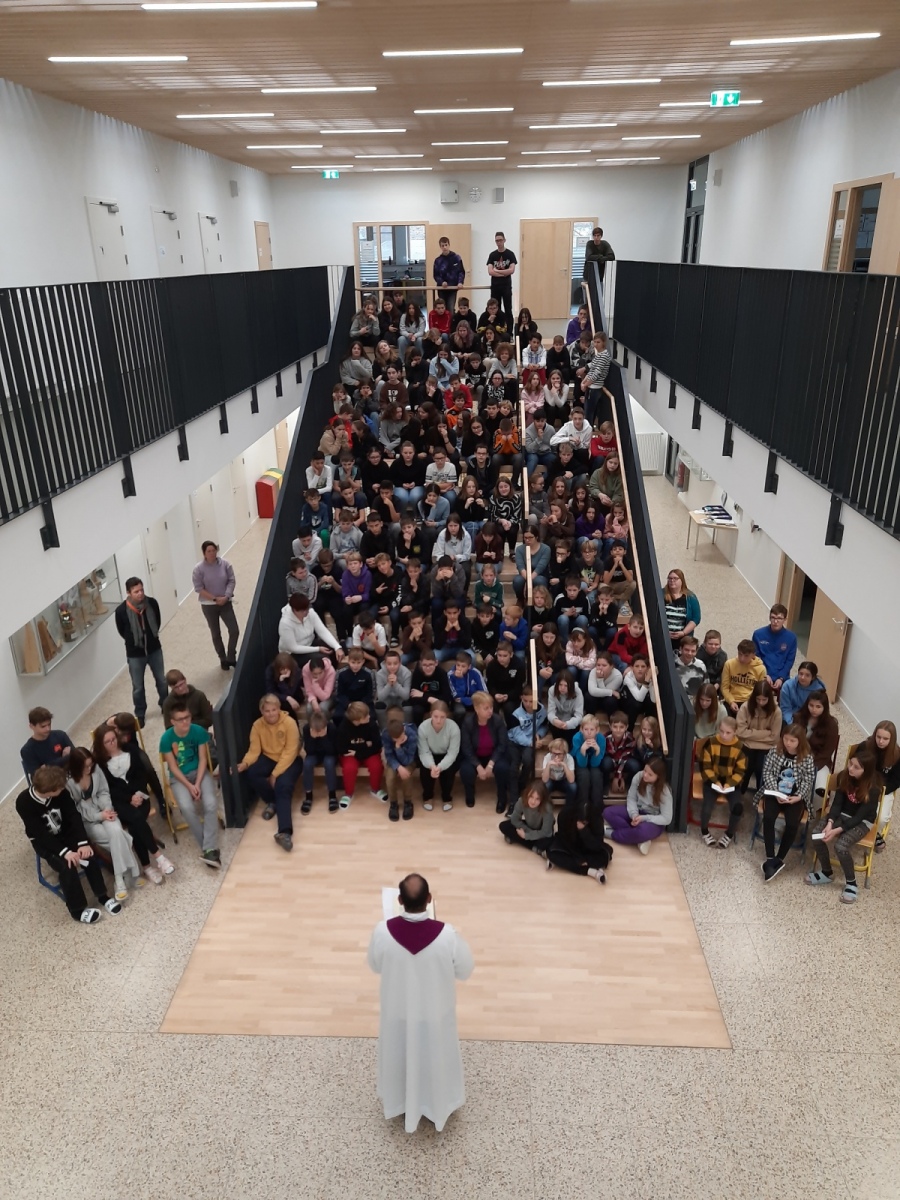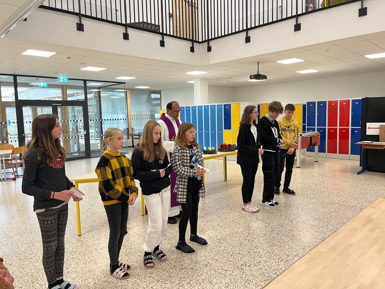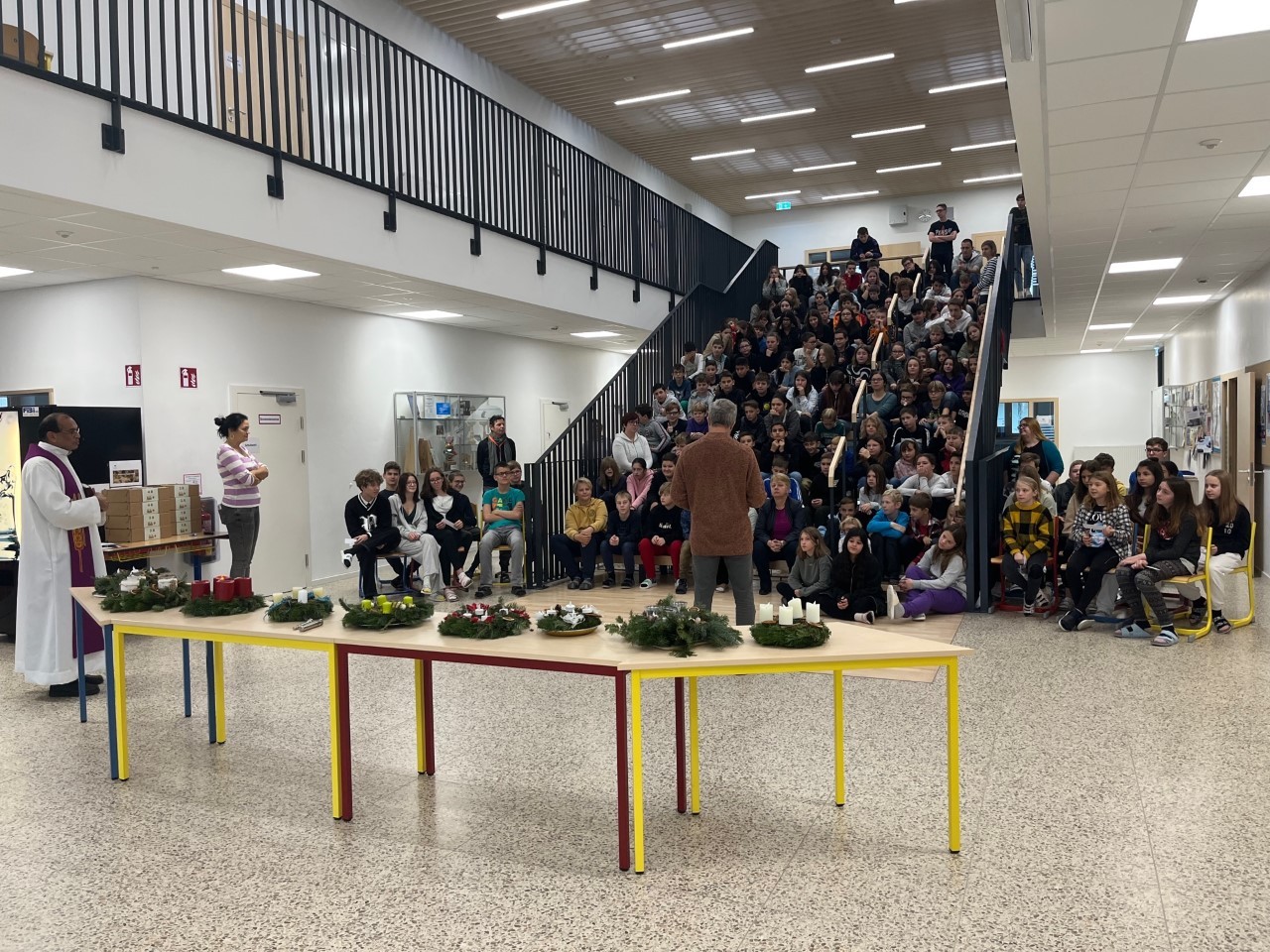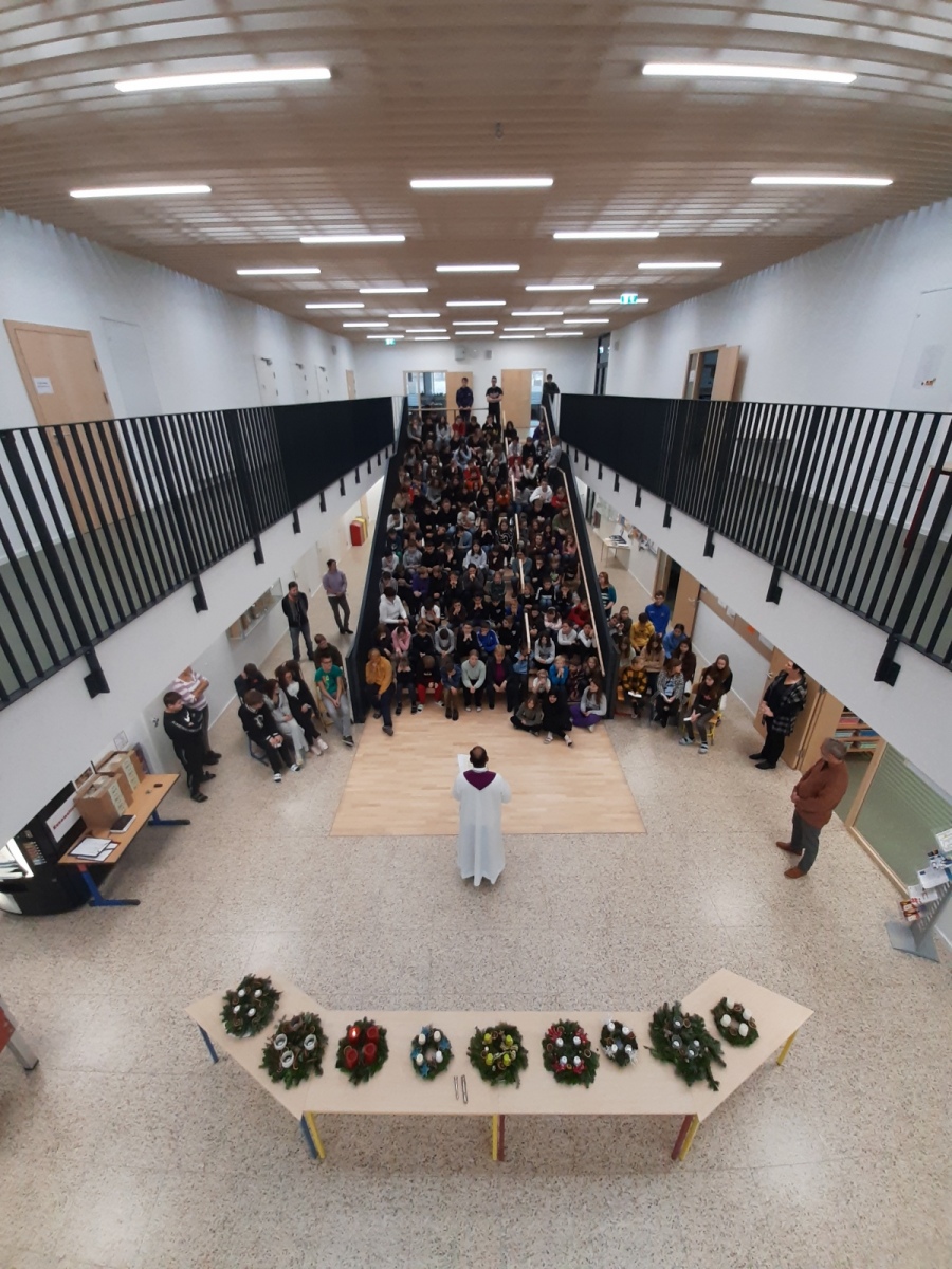 Der aus Indien stammende Kaplan las aus dem Brief an die Epheser vor. In dieser Bibelstelle geht es um das Licht, welches Jesus in die Welt bringt. Nachdem sieben Schüler*innen Fürbitten vorgetragen hatten, segnete der Kaplan die Adventkränze und richtete noch Friedensgrüße an die Anwesenden.