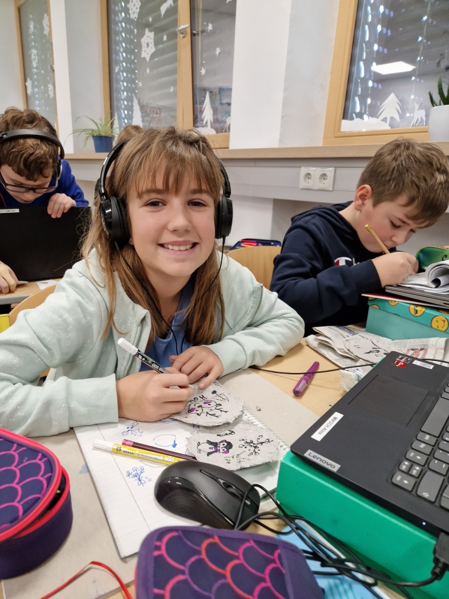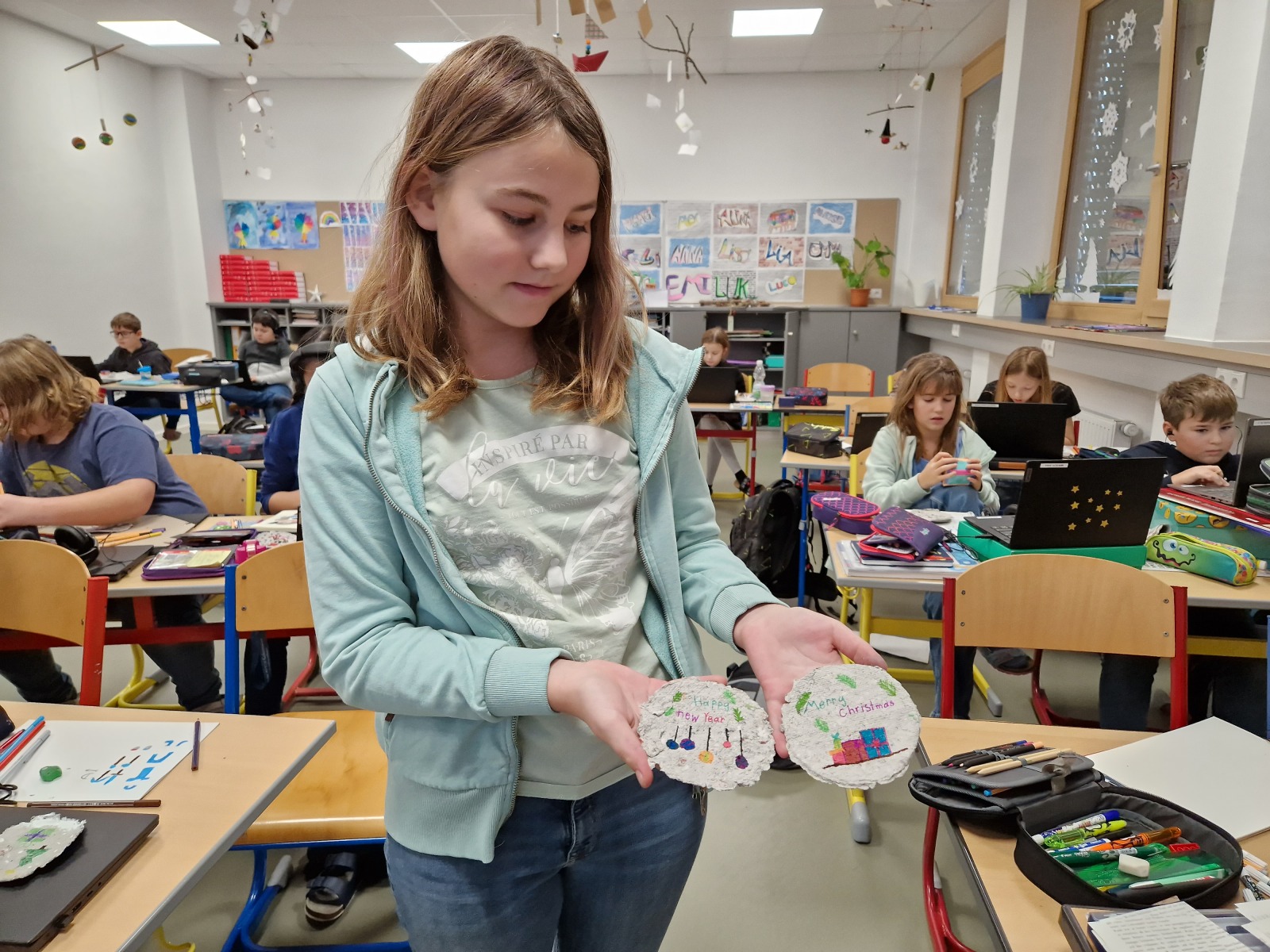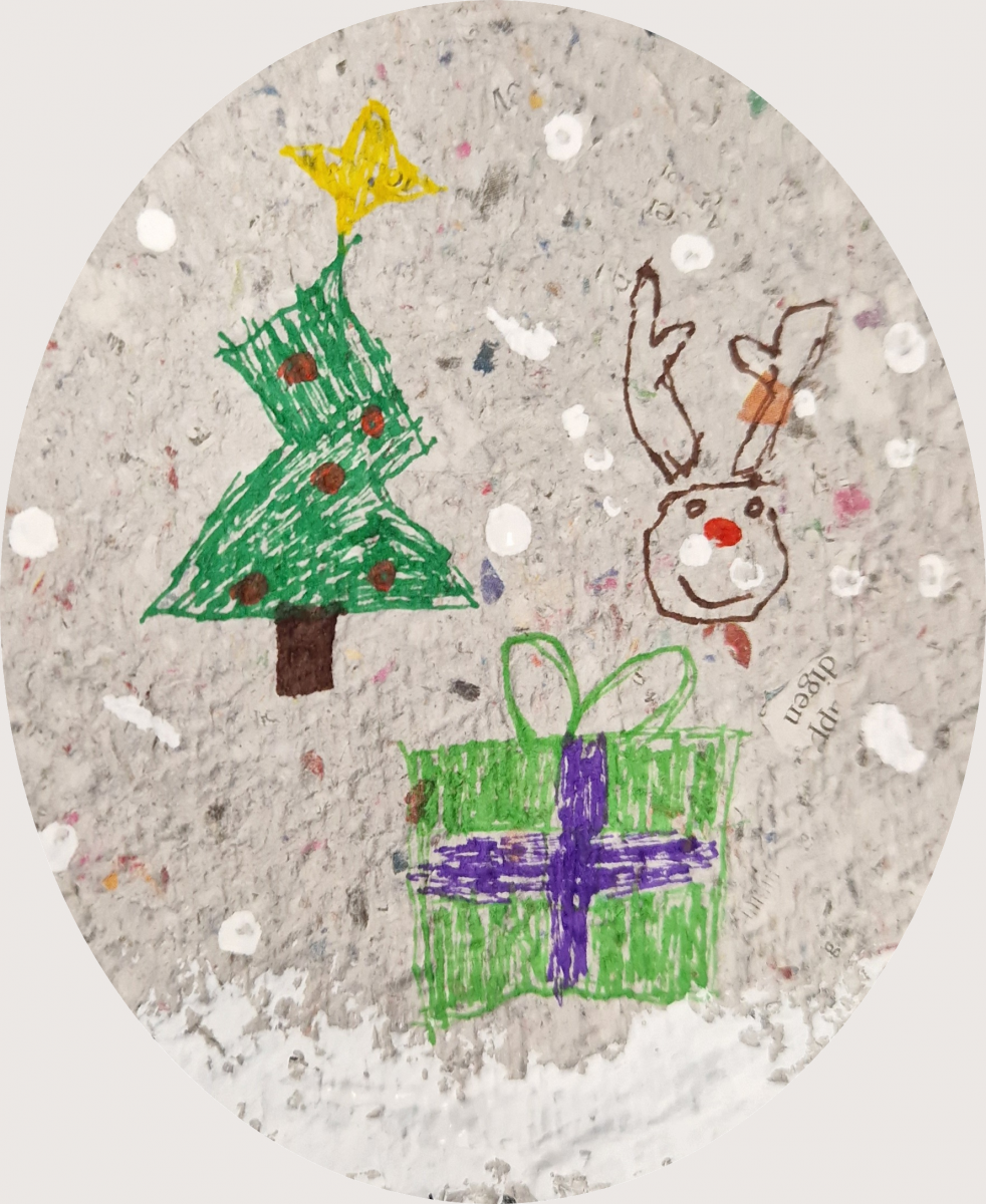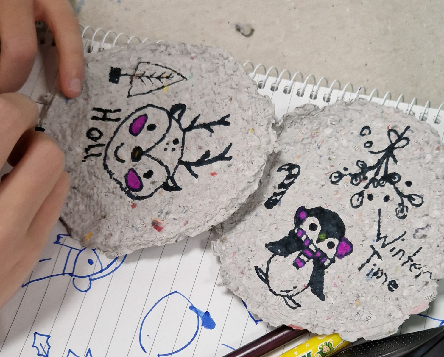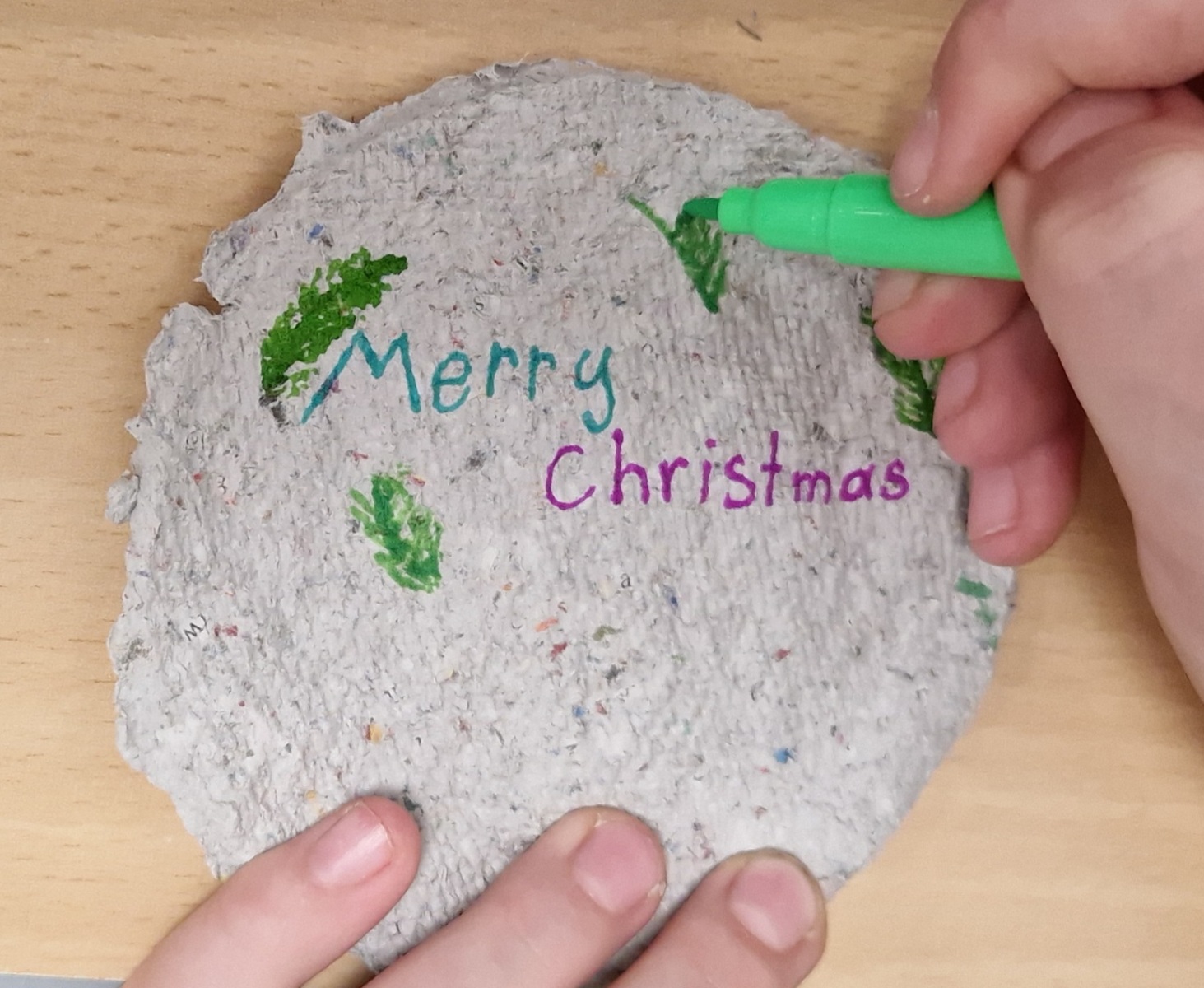 Ein paar Tage später gestalteten die Kinder auf ihren selbst geschöpften Papierkreisen schließlich noch schöne weihnachtliche Grüße und Bilder.