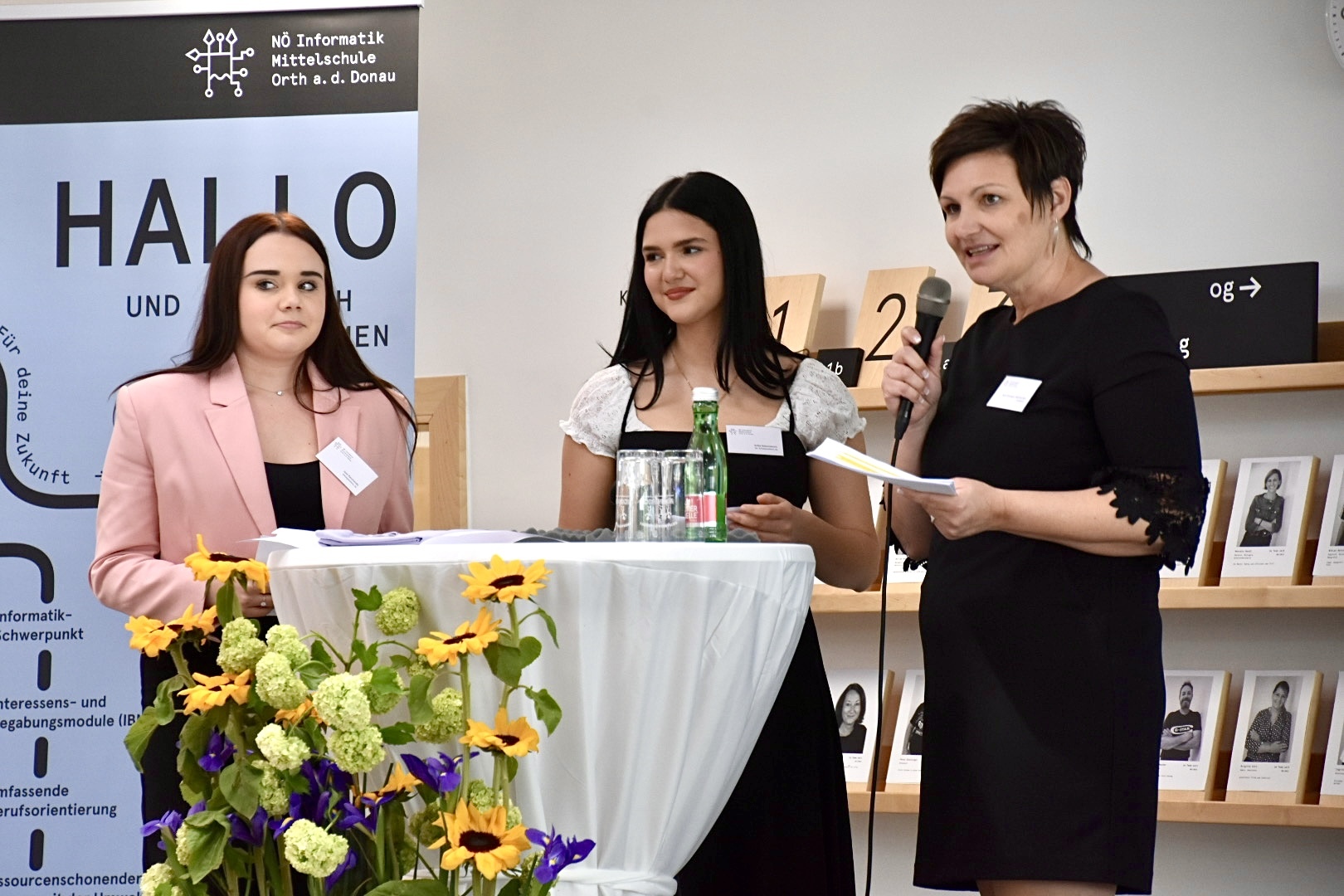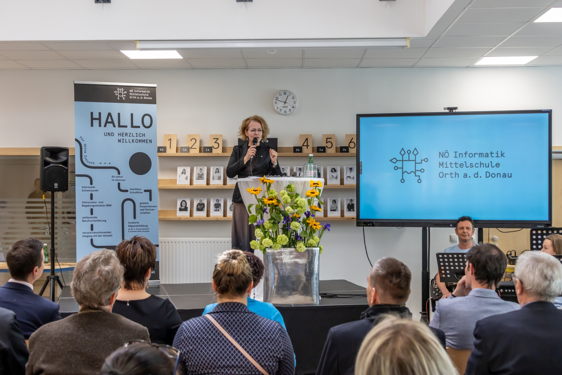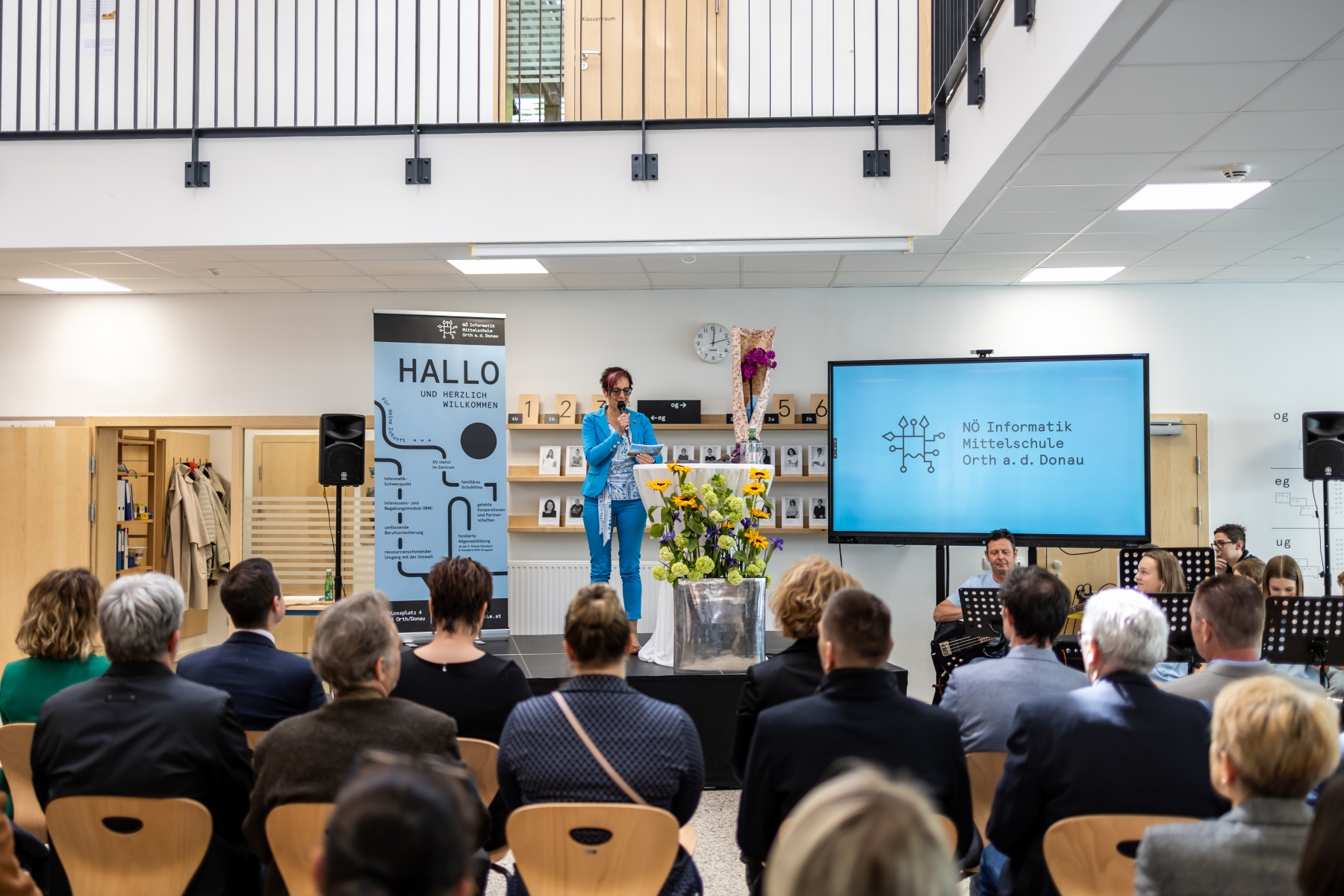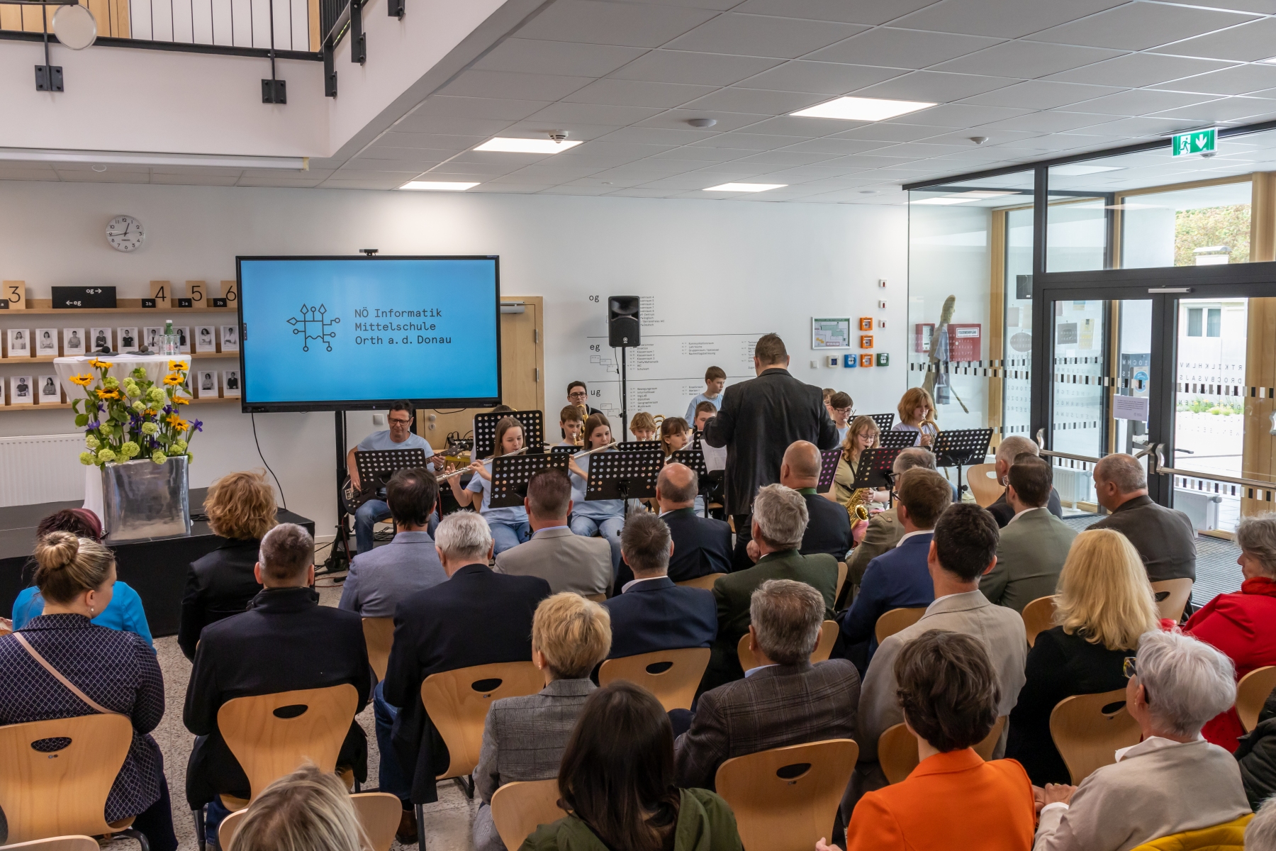 Im Rahmen der Eröffnungsfeier berichtetet die Obfrau der Mittelschulgemeinde, Bürgermeisterin Elisabeth Wagnes, vom Mut der Gemeinden zu diesem Millionenprojekt und bedankte sich für die gute Zusammenarbeit. Im Anschluss erfolgte anhand eines Interviews der Schulleiterin Ingrid Rohringer und den beiden Schulsprecherinnen Jana R. und Sofija B. eine Rückschau der mehrjährigen Baugeschichte. Ein Highlight der Feier war die virtuelle Grußbotschaft von Bildungsminister Matin Polaschek und die Festrede von Christiane Teschl-Hofmeister in Vertretung der Landeshauptfrau. Abschließend erfolgte die Segnung durch Pfarrer Erich Neidhart. Die Bläserklasse der IMS Orth/D. zeigte mit ihren Darbietungen ihr Können und sorgte für einen besonders feierlichen Rahmen der Eröffnungsfeier.