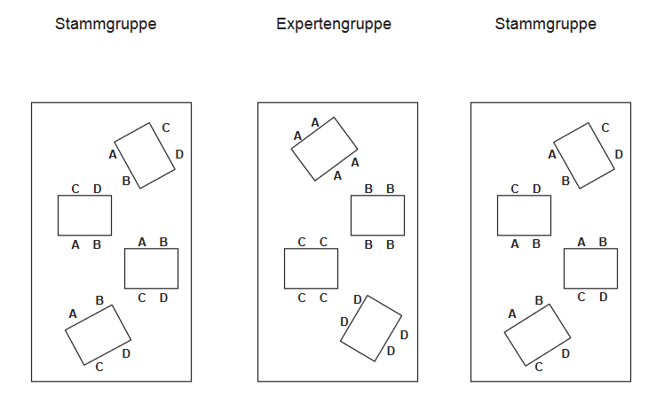 Schüler*innen erwerben in Kleingruppen Kenntnisse, die sie anschließend in den anderen Gruppen multiplizieren.
